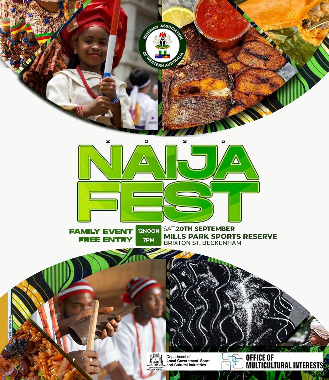 September 20, 2025 @ 12:00 pm - 7:00 pm Naija Fest ’25 Mills Park, Brixton St. Beckenham WA 6017 Mills Park, Brixton St., Beckenham